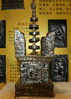 杭州西湖邊的雷峰塔,除了讓人聯(lián)想到白娘子和許仙的浪漫傳奇,那座2001年在地宮出土的銀制“阿育王塔”也是其重寶。但很多人不知道,“阿育王塔”還有一座“姊妹塔”——即天宮中的阿育王塔,因出土?xí)r破損嚴(yán)重,一直藏于文保部門。昨天,成功修復(fù)后的雷峰塔天宮銀質(zhì)鎏金阿育王塔首次與世人見面——浙江博物館專門進(jìn)行了《天覆地載——雷峰塔天宮阿育王塔特展》,展出五代吳越國王錢俶鑄造、歷代民間仿造的阿育王塔30余座,其中1級品10余件,為國內(nèi)首次對阿育王塔的集中展示。
