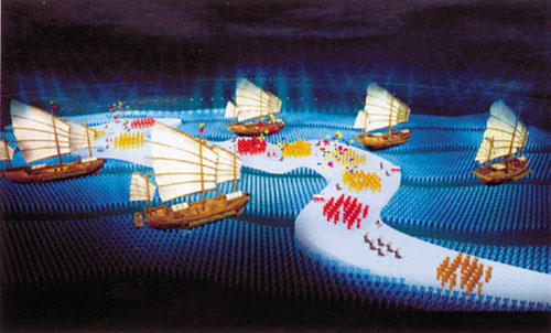 廣東團(tuán)隊(duì)9人分頭醞釀構(gòu)思后,集中在南海里水的一家賓館“封閉”。某天,陳中秋、謝曉泳和黃力生站在賓館房間陽(yáng)臺(tái)冥思苦想,突然靈機(jī)一動(dòng):地面不也可以變成“熒屏”嗎?如果把整個(gè)場(chǎng)館的地面變成一個(gè)LED的大屏幕,可按要求不斷變換逼真的圖像,團(tuán)體操隊(duì)員和演員在“地?zé)善痢鄙媳硌,圖像、色彩完全和演出能融為一體。