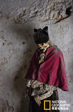 美麗小鎮(zhèn)諾瓦拉有一座規(guī)模宏大、富麗堂皇的教堂。祭壇前方有一扇通向地下密室的暗門,只需撳動一個隱藏的按鈕,電控開關(guān)就會把門打開,如同007電影中的情景。下了臺階就能看到一列壁龕,存放著衰敗程度各不相同的主教尸體。他們坐著鑿了些圓孔的小石椅(供體液滲流),面容僵直,像是在一起享受公廁里的放松時刻。一座擺滿了頭骨的高架子上有個盒子,里面裝著兩具自然干化的貓尸,恍若古埃及的魅影。它們困在這地下墓室里,提醒著人們:即使真有九條命,歸宿也只有一種。 (來源:《華夏地理》雜志 )