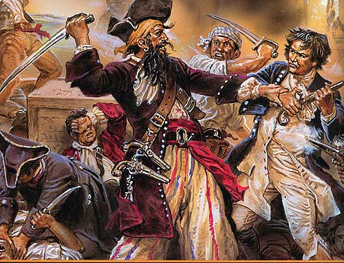 作為加勒比海盜的領(lǐng)軍人物之一,黑胡子見證了加勒比海盜的興起。黑胡子原名愛德華 蒂奇,1680年出生于英國,十幾歲時他便登上一條英國海盜船當(dāng)了一個小海盜,這條海盜船擁有英國政府頒發(fā)的私掠許可證,因此可以在英國政府庇護(hù)下攻擊和掠奪敵對國家的商船。成年后,愛德華留起了一臉濃密的黑胡子,有時還會編成小辮,由此他獲得了黑胡子的綽號。據(jù)說,他力大如牛、酒量過人,可以在一整天海戰(zhàn)后,豪飲一夜朗姆酒,然后精神百倍地再次投入廝殺;因為嫌烈性的朗姆酒不夠勁,他還常常要在酒里灑上一把火藥。