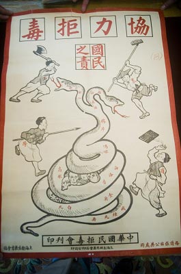 在檔案館此次展示的檔案中,有四張招貼畫十分引人注目,在其中的一張招貼畫上,一個孩子被各種毒品團團綁住,動彈不得,周圍則是一些運送、販賣毒品的場景,“這個孩子,指的其實是當時的中國!边@四張招貼畫曾在1927年被張貼于上海的大街小巷,“在萬國禁煙會之前,上海民間的禁毒行動就一直存在,之后,更加是引起了一股禁毒的思潮。坐落于圓明園路的中華國民拒毒會就是一個典型的民間組織,雖然成立于1920年代,但和這股思潮是分不開的!毙辖ㄩ沤榻B,當時的拒毒會除了張貼招貼畫、舉辦各種公益的講座之外,還曾經(jīng)組織運動會,用健身的理念來抗拒毒品的誘惑。