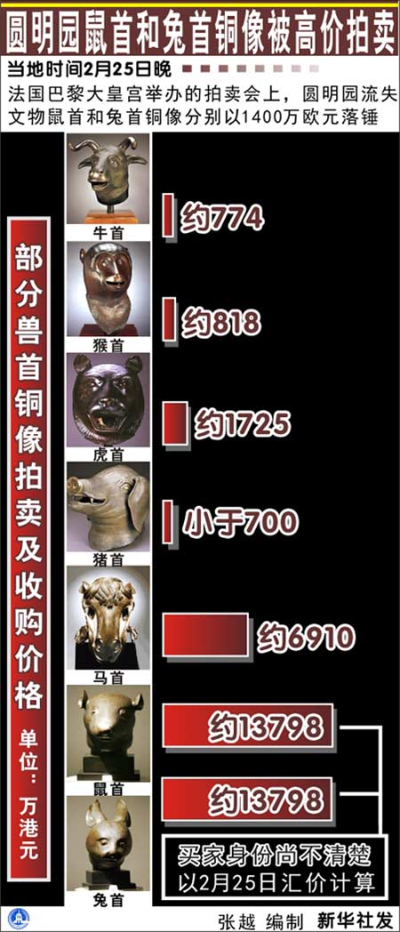 據(jù)美國《紐約時(shí)報(bào)》網(wǎng)站2月26日?qǐng)?bào)道,從中國掠走的兩尊獸首銅像25日晚以總額近3590萬美元的價(jià)格(不含傭金)成交。此前,獸首拍賣遭到了中國強(qiáng)烈卻徒勞的抗議,要求停止拍賣的法律訴訟也以失敗告終。