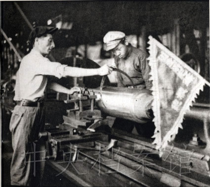 9. 1950年,天津制鋼廠生產模范徐敬生利用廢材做了三百四十多種器材,圖為他和工人們在做新的馬丁爐鋼架