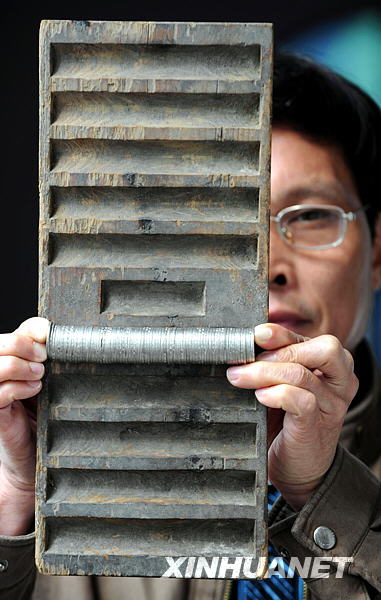 據(jù)介紹,這塊清代使用的“點鈔機”狀似算盤,長37厘米,寬16厘米,內(nèi)刻有11條凹槽,直徑同當時流通的銅幣直徑吻合,其中10條長凹槽可一次性勘驗1000枚銅幣,中部的一條短凹槽可勘驗50枚銅幣。新華社記者彭張青攝