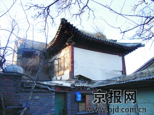 東西兩側的立面的二層也是各一六角弦窗,而一層由于雜房遮擋,已經(jīng)無法看見它的本來面部。早年岱王廟山門門楣之上懸掛有一塊漢白玉石刻的“岱王廟”匾額,廟內(nèi)正殿供奉著佛像,廟內(nèi)清幽肅穆,香火繚繞,梆槌聲聲。廟前山門左右兩旁各有一棵巨大的槐樹(今存一棵),一條東西大道在門前經(jīng)過。