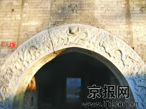 岱王廟坐落在盧溝橋西側的橋西街5號,坐北面南。遠遠望去,岱王廟建造的十分精巧,醒目。當?shù)匕傩账追Q它為大王廟或大廟。岱王廟的山門和戲樓,平面呈T字形布局,銜接緊密,融為一體,是一座上下二層硬脊歇山頂磚木結構的建筑。歷經(jīng)滄桑歲月,房脊兩頭的吻獸早已蹤跡皆無,只有東西山墻頂部的鈴鐺排山,保留的還算完整。整座建筑用青磚砌成,磨磚對縫,對仗工整,呈現(xiàn)了清時期的建筑風格。山門的一層中央是石制拱形券門,券門兩旁是各一長方形豎窗。石制拱形券門刻有石雕,門首弧頂上方雕刻著探首的夔龍,在片片的祥云中翻轉(zhuǎn)騰挪,吞云吐霧。夔龍兩側各刻有兩條玩耍的蟠龍,像眾星捧月一樣游弋在探首的夔龍身邊。最為有意思的是,石制拱形券門兩側下部的石雕上,各刻有一只在水中山石間吐水的小獸,造型奇特,形態(tài)逼真,顯現(xiàn)出十分生動有趣的畫面,給整座石雕增添了一筆頑皮的色彩。整個券門上的石雕布局嚴謹,古樸典雅,雕工灑脫,莊重中不失諧趣,顯示出那個時代工匠們的高超技藝。