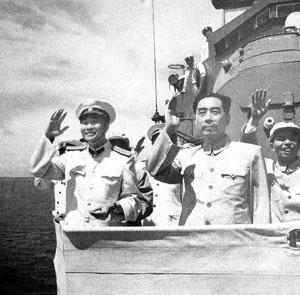 周總理以莊嚴的注目禮接受了報告。然后邁著緩慢的步子,檢閱碼頭上的軍官隊伍。他不時舉起右手,向嚴整的受閱部隊致意。