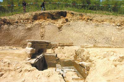 汪大猷墓位于余姚市大隱鎮(zhèn)下磨村后山。記者昨天趕到現(xiàn)場,老遠(yuǎn)看到一座山,幾乎半個面都被開掘出來,相當(dāng)壯觀。沿著泥沙路往上走,路慢慢地變窄。不一會,前方出現(xiàn)一條亂石鋪成的道路。參與此次考古發(fā)掘的考古隊(duì)隊(duì)員羅鵬告訴記者,這是墓前的神道,以前神道兩旁各有對稱的石羊、石馬、石虎和石人4對石像生。不過年代久遠(yuǎn),其中幾座遭到損壞,現(xiàn)尚有4座保存在村民家中。記者眼前只見磚頭搭起的基座。