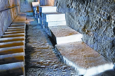 與連環(huán)翻板功能類似的,是鐵索吊石。主要是在墓道頂和墻壁隱蔽處固定若干金屬滑輪,利用滑輪將巨石吊起,懸于頂端。墓道地下鋪木質(zhì)蹺板,索鏈由石板而下,通過滑輪以隱蔽的方式連接蹺板,中間有掛鉤和脫鉤相接,遇外力壓迫可自動脫落。蹺板呈條狀,長寬根據(jù)墓道具體情況而定。吊起之石可在墓道頂部懸掛三層,各層互不相依,索鏈通過石上孔洞收縮進出。