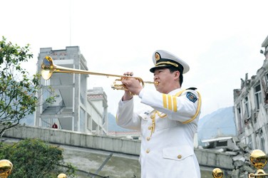 昨天下午,當(dāng)中央領(lǐng)導(dǎo)同志和各界人士在汶川映秀鎮(zhèn)的地震記事墻前獻(xiàn)花時(shí),小號(hào)聲聲相伴,旋律飄揚(yáng)空中,音樂(lè)深情感人。記者經(jīng)過(guò)曲折采訪,了解到這首《思念曲》的作曲是中國(guó)人民解放軍軍樂(lè)團(tuán)青年作曲家郭思達(dá),演奏者是該團(tuán)樂(lè)手王強(qiáng)。