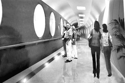 水下博物館在水下40米處,環(huán)境極為特殊。要進入水下博物館,必須要經(jīng)過一個和乘飛機類似的安檢程序。之后踏上一條長88米的電梯,進入水深40米處。再通過一條約150米的平直交通走廊,在邁過一道寬約一米、厚約半米的鋼制艙門后,進入到60多米長的環(huán)形參觀走廊。