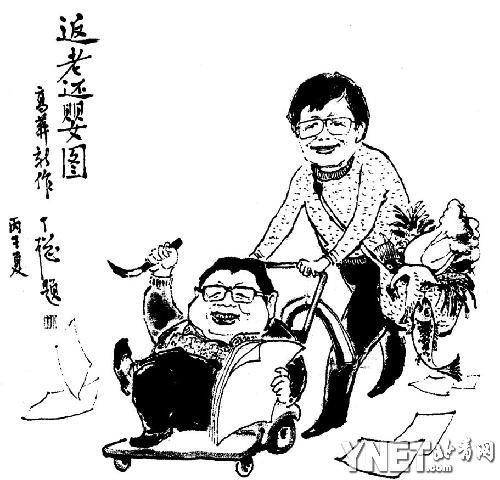 吳瓊向記者轉(zhuǎn)述的老人去世前的一些細(xì)節(jié)頗令人動容:81歲的沈峻老人一直像照顧孩子一樣照顧病中的丁聰。直到老人停止了呼吸,她覺得還有些事沒有交待清楚,于是又在丁聰衣兜里一邊放上了餐巾紙,一邊放上牙簽這兩樣丁聰出門必備的小物件。沈峻還給丁聰?shù)囊路锎狭烁呙L的《返老還童圖》并附上親筆信,大意是“小丁老頭,我推了你一輩子,把你推到了最后,剩下的路該你自己走了,不過我們很快就會又見面的!彼詈笥纸o丁聰衣襟里放上了老人生前最愛的幾樣零食:巧克力、花生米和咖啡,之后就決定不再來看丁聰了。