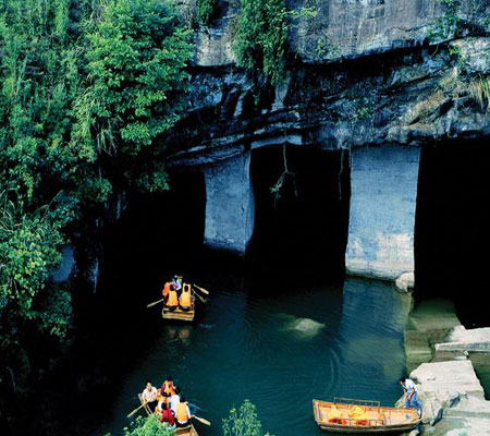 特別值得一提的是洞口處的通海橋,橋下一潭清澈見底的泉水嘩嘩作響,很可能存在活的水源。溯流而下,到了洞內(nèi)最低處,石壁清晰可見精雕細刻的花紋。雖然這里已經(jīng)位于新安江水面以下2米,上下落差有25米,但是洞內(nèi)通風狀況良好,并無任何不適感覺。另外,洞窟的怪異構(gòu)造使得聲波被石壁吸收,無論多么大聲喧嘩,在洞內(nèi)都聽不到一絲回音。