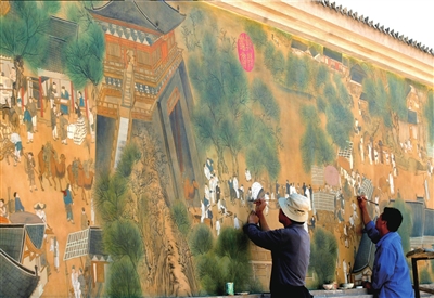 經(jīng)過近倆月的努力,昨天,在延慶大榆樹鎮(zhèn)奚官營村,一幅由4名農(nóng)民畫家集體創(chuàng)作的《清明上河圖》壁畫終于落成。村委會表示,將在村里其他角落繪制壁畫,打造“亞洲第一壁畫村”。