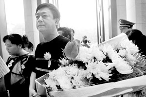 朱軍手捧的花束由菊花和季羨林生前最喜歡的荷花組成。記者注意到,在來賓簽名冊上,他簽下的名字是朱一軍。