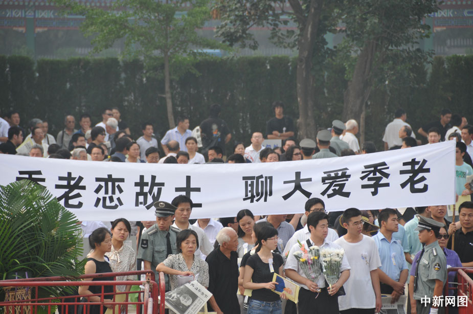 筆者在現(xiàn)場(chǎng)看到,一則書(shū)寫(xiě)著“季老戀故土,聊大愛(ài)季老”的橫幅格外醒目。季先生的幾位年輕老鄉(xiāng),在悶熱的幾個(gè)小時(shí)里,一直舉著橫幅,直到筆者離開(kāi),還佇立在殯儀館外。