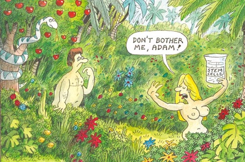 7月9 日,英國《太陽報(bào)》登出一張漫畫,在漫畫中,置身于伊甸園中的夏娃手持一只貼著“干細(xì)胞”標(biāo)簽的燒杯,一臉傲慢地說:“亞當(dāng),請別煩我!”對事件的中心人物納伊尼亞教授而言,倫理上的質(zhì)疑和爭議似乎并沒有給他帶來什么困擾。他認(rèn)為此項(xiàng)研究可以為那些想要孩子卻沒有能力的家庭帶去福音,而爭議則“完全可以通過法律最后進(jìn)行規(guī)約”。面對紛至沓來的媒體,納伊尼亞教授仍沉浸在實(shí)驗(yàn)成功所帶來的興奮之中:“這太令人興奮了!這些人造的精子有頭,有尾巴,也可以移動,它們具備能夠產(chǎn)生生命的一切特質(zhì)!”
