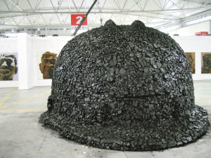 現(xiàn)場最扯眼球的作品是藝術(shù)家張建華的雕塑作品《礦工帽》。張建華說,這個礦工帽用了3噸煤塊貼滿,更像一座孤墳,他希望以此反映農(nóng)民工在社會發(fā)展過程中付出的沉重代價。