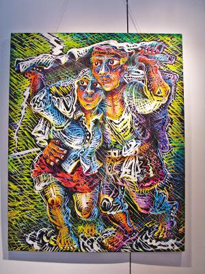 據(jù)介紹,在120位參展藝術(shù)家中,就有13位重慶藝術(shù)家,除了羅中立、傅文俊、李一凡三位參加主題展的藝術(shù)家外,還有10位來自川美的藝術(shù)家進入了新人特區(qū)展。羅中立四幅最新力作首次展出也是雙年展另一個焦點。昨日,記者在現(xiàn)場看到,羅中立的四幅作品分別是《下梯的農(nóng)婦》、《過河系列一》、《吹燈》、《雷雨》,內(nèi)容都圍繞鄉(xiāng)村愛情。但在昨日的開幕儀式上,羅中立和陳丹青都因故沒有出席。