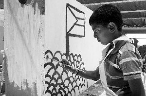而畫家黃銳介紹,他用了一個多月時間來創(chuàng)作自己的這個作品。在他那塊“墻石”上,黃銳“玩了一個文字游戲”:從2個字母或者2個詞組合演變成20個詞,他以這種“形象記憶”記錄下在不同時間里發(fā)生的事情。