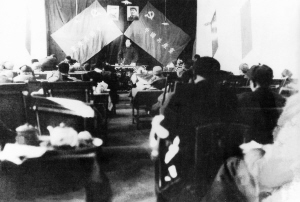 會(huì)場(chǎng)并不大,只有一百多平方米,是中央工委時(shí)期修建的大伙房。會(huì)場(chǎng)布置得非常簡(jiǎn)樸,正面墻上懸掛著毛澤東和朱德的照片,兩邊墻上是鮮艷的中國(guó)共產(chǎn)黨黨旗。主席臺(tái)是一張舊長(zhǎng)桌,上面一條花毛毯上鋪放了一張虎皮,為會(huì)場(chǎng)增添了一些威嚴(yán)。