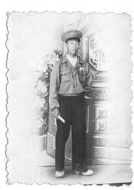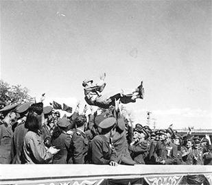 閱兵結(jié)束后,張百川跟同學(xué)們紛紛跑到照相館拍照留念。大家都穿著閱兵時(shí)的裝束:為閱兵專門配發(fā)的綠色飛行員帽子、上衣,白色襯衣,腳上穿著咖啡色的仿毛皮鞋。張百川介紹說,原本發(fā)的是普通的軍用膠鞋,為了踢正步時(shí)鏗鏘有力,特意發(fā)放了這樣的皮鞋,據(jù)說是抗日時(shí)繳獲日軍的。