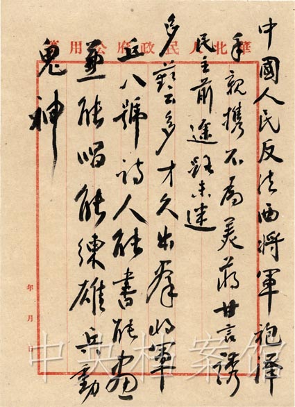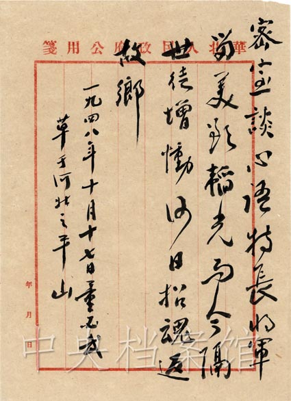 1949年 9月 1日,馮玉祥遇難周年祭日追悼會在北京舉行,出席者有李濟深、宋慶齡、周恩來、沈鈞儒、張瀾、何香凝、郭沫若、林伯渠、吳玉章、董必武及馮玉祥夫人李德全等 600余人。毛澤東、朱德及各民主黨派、各人民團體送了挽聯(lián)花圈。毛澤東親筆題詞: “馮玉祥將軍逝世周年紀念謹致悼意。 ”周恩來在致詞中說:馮玉祥先生從一個典型的舊軍人轉(zhuǎn)變成為一個民主的軍人,他經(jīng)過了曲折的道路,最后走向新民主主義的中國。馮先生堅決地拒絕了美帝國主義對他的誘惑,毅然離美準備回到中國解放區(qū),接受參加新政治協(xié)商會議的號召,不幸遇難,實值得大家紀念。
