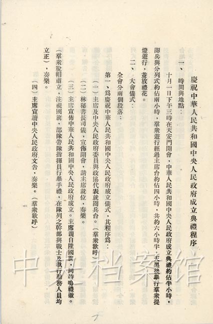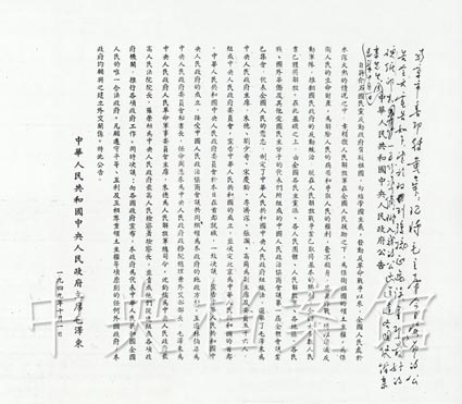 毛澤東主席莊嚴(yán)宣布:“中華人民共和國(guó)中央人民政府已于本日成立了!辈⑶矣H手升起國(guó)旗——五星紅旗。升旗儀式后,毛澤東宣讀《中華人民共和國(guó)中央人民政府公告》。