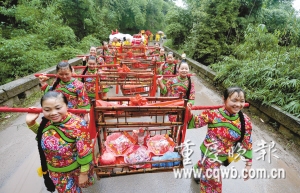 “人逢喜事精神爽,不知不覺就走攏了;恭喜主人,花轎來到你家門;你姑娘打扮好沒有?迎親隊伍都到了喲……”媒婆打招呼,成了新娘出閣特定的開場白。與女方對答完后,媒婆一聲“把禮盒抬進(jìn)去”,男方迎親隊伍中的總管即出列呈上禮單。之后,新娘“忙”起了上花轎前的出閣儀式:踩斗、丟筷子、罵媒、父親壓轎、哥哥背上轎、哭嫁。