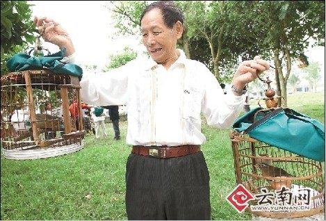 上午11點(diǎn),結(jié)束了當(dāng)天的鳥(niǎo)市后,勐捧農(nóng)場(chǎng)武裝部職工何保平的一只畫(huà)眉鳥(niǎo)得到了冠軍!氨緛(lái)去年有人開(kāi)價(jià)1.5萬(wàn)元都沒(méi)有搞到手,不過(guò)今年由于它原來(lái)的主人忙著要去打理生意,被我3600元就撿個(gè)大便宜買(mǎi)了下來(lái)。”何保平興奮地對(duì)記者說(shuō):“不過(guò),我們這里有一個(gè)沒(méi)有人敢挑戰(zhàn)的鳥(niǎo)王。”說(shuō)話(huà)間,他將記者領(lǐng)到了一位正把玩著兩個(gè)鳥(niǎo)籠、精神矍鑠的老人面前,告訴記者,他就是這一帶公認(rèn)的“鳥(niǎo)王”張陸成。