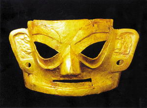 “儺”,指人們在特定季節(jié)驅(qū)逐疫鬼的祭祀儀式。這個祭祀儀式最大的特點是驅(qū)逐疫鬼的人必須帶上青銅面具。馮廣宏說,“在古代,面對瘟疫和戰(zhàn)爭時人們會首選‘儺’法,特別是在推崇神靈的殷商時代,直到漢代宮廷里每年還舉行大儺!比嵌殉鐾廖奈镏杏幸粋黃金面具,馮廣宏認(rèn)為,在上古儺文化里就有“黃金四目”的法師在施行驅(qū)趕疫鬼的儺法。而載歌載舞、繁瑣復(fù)雜的“儺”儀式中有許多配套的青銅面具和法器,“儺”儀式結(jié)束后,這些青銅面具和法器被認(rèn)為已沾染了“鬼氣”,所以要全部砸毀,焚燒后埋入土中。