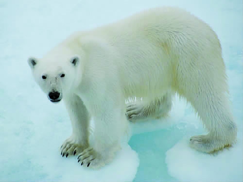 北極海冰也在不斷融化。1993年夏天,北極海冰覆蓋面積約為750萬平方公里。到2007年9月,北極海冰覆蓋面積僅剩430萬平方公里。據(jù)估計,北極海冰即將面臨再一次的大面積崩塌。在北極海冰融化過程中,北極熊將是最大的受害者。圖中這頭雌性北極熊正站在一塊浮冰上在科考船周圍巡游。美國科學(xué)家曾經(jīng)在一份研究報告中警告,到2050年,北極熊或?qū)缃^。