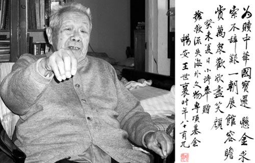 2002年搶救流失海外文物專項(xiàng)基金成立,邀請(qǐng)王世襄先生擔(dān)任顧問,他欣然應(yīng)允。他說,被掠奪的文物,如龍門、云岡石窟被盜掘的文物,應(yīng)該無償追回。這些文物必須歸還回原地,因?yàn)樗麄兪峭辽灵L的,根在國內(nèi),是上下相連的。王世襄先生對(duì)成立一個(gè)以搶救流失文物、保護(hù)文化遺產(chǎn)的公益組織頗感快慰。興奮之余他賦詩一首:為贖中華國寶還、懸金求索不辭艱。一朝展館容瞻賞,萬眾歡欣盡笑顏。