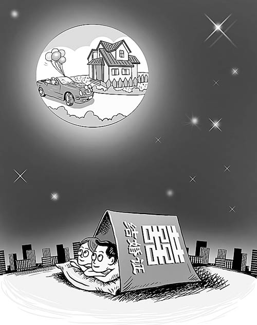 不買房,不買車,不辦婚禮,不買婚戒……除了花九塊錢去登記處辦理紅艷艷的結(jié)婚證,其他都可以不要。近來,網(wǎng)絡(luò)上的一篇題為“一個(gè)裸婚者的自白”的帖子,引發(fā)網(wǎng)友關(guān)注!奥慊椤保@個(gè)在2008年全球金融危機(jī)下誕生的新詞兒,在2009年不斷上揚(yáng)的房價(jià)“助推”下迅速流行。新浪網(wǎng)網(wǎng)友“同道”稱,“‘裸婚’是高房價(jià)賜給白領(lǐng)的‘新時(shí)尚’!