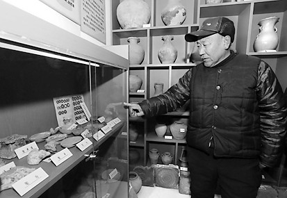 周圍村子里有幾個(gè)磚廠,燒窯就要取土,每次他都等在現(xiàn)場,總會從灰土里找到一些東西,有帶著銅銹的刺鉤、刻著銘文的瓦當(dāng),還有一些用于占卜的骨頭。他把自家三開間的東廂房,專門安置收藏的文物供人參觀。陶器、瓷器、青銅器,他收藏了有上千件,除了自己撿到的,還有一小部分是他買來的,花錢并不多。