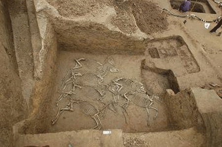 墓室上口長6.2米、寬5米。墓道長15.7米。兩座墓均為南北向,人骨均已散亂,器物箱內都放置鼎、簋、盤、匜、矛等青銅器、車馬器和陶鬲;墓道內均隨葬兩輛馬車和一只狗。墓葬出土玉器10余件,青銅器50余件,其中8件有銘文。在大墓與祭壇之間發(fā)現(xiàn)5座馬坑和1座車馬坑。馬坑僅有馬骨架,其中一座殉馬2匹;兩座殉馬各8匹,分兩排整齊擺放;兩座殉馬各6匹,其一分兩排擺放,前2后4,另一座為兩兩成對放置,頭向不一,中間放置一件牛角。車馬坑長14米,寬3.4米。內置3輛車,前兩輛皆四駕,后一輛兩駕。馬頭上均有精美的青銅和串貝飾件。因天氣和水位過高,現(xiàn)正在對車馬坑進行整體提取,移至室內清理。