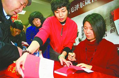 3點30分,簽售活動正式開始。人們按照順序,依次走到簽售臺前請孔東梅簽名,有的人還對其表達著對毛澤東的熱愛之情,有的則和她合影留念。