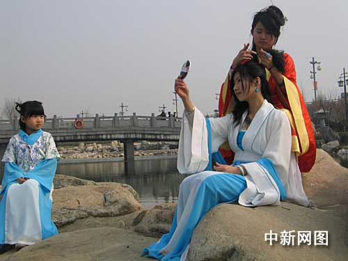 記者在現(xiàn)場看到,穿著大袖翩翩、交領(lǐng)、右衽的漢服,一群花樣年華的少女坐在草地上,相互打扮。有的描眉涂粉,有的盤髻插釵,有的對鏡貼“花黃”。據(jù)漢服愛好者“琉璃”透露,遠在漢代,中國女子已廣泛使用口紅。從二千多年前的前漢長沙馬王堆一號漢墓中出土的漆器梳妝箱中,除有發(fā)綹、梳子和香粉外、還發(fā)現(xiàn)有燕脂。 眉筆在古代又名“黛”,后漢初期,長安地區(qū)的女子盛行畫“寬眉”,當時用的是青藍色眉筆。到了唐代,則流行畫蛾須(觸角)眉。
