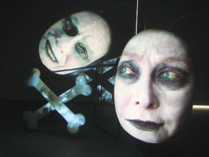 三月的雪覆蓋了林冠畫廊門前的小徑,這似乎到了觀看托尼·奧斯勒(Tony Oursler)的影像裝置的最佳時(shí)機(jī);煦绲氐羧胨囆g(shù)家布置的小黑屋子里,游走其間的觀者開始不安于他的觸感,面對(duì)人類認(rèn)知的有限,由這些虛擬的畫面幻化出的立體圖像空間忽然間開啟了一扇門。高清晰度的投影打在高低參差的柱狀體上,呈現(xiàn)的是各種品牌的香煙所經(jīng)歷的不同程度的燃燒(《香煙》):蟄伏于人內(nèi)心的欲望扭結(jié)成藤蔓狀一點(diǎn)點(diǎn)滋芽、生長(zhǎng)然后腐爛、撕裂;森然而立的香煙巨塔又如摩天怪物,從廢墟里復(fù)活,勤勉地攀爬至高處卻終至跌落和傾覆,從這里仿佛聽到了世上眾多被無名之火吞噬的龐然大物的嘆息。來自“9·11”國(guó)度的藝術(shù)家可能沒有料到,他的香煙柱陣無形中祭奠了中國(guó)的央視塔樓焚滅于元宵煙火的厄運(yùn)。與燃燒相關(guān)的《FX》凸現(xiàn)了一個(gè)爆炸的火焰團(tuán),從中隱約見到一個(gè)正趨于消失的人頭,好萊塢災(zāi)難片迭現(xiàn)的恐怖主義導(dǎo)彈轟然在你面前炸響,你好似走到了地獄門前,綿延的地火緩緩地吸吮著人的精華,經(jīng)末日審判的肉身最終歸于灰飛煙滅。