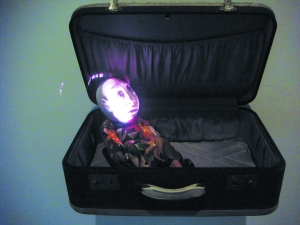 立于《玩偶》前有一刻驚悚。被拋擲于衣箱內(nèi)的小人兒身子是實(shí)在的布偶,頭部卻是虛幻的投影,他圓睜的大眼無辜地注視著頭頂上方,那個(gè)隨時(shí)將要闔上的衣箱蓋既壓迫他的頭顱,也壓迫他那嬰孩的小身軀里裹著的小小的心臟。他望見了什么?圣馬可看見耶穌復(fù)活了嗎?人類等待救贖的命運(yùn)竟然就被歸置于這個(gè)如此狹小的空間。另一刻,《雙頭》的猙獰堪叫人絕望。相互注視的兩張面孔應(yīng)是一男一女,慘白的面頰、深陷的眼眶、漫漶的眉發(fā)均噴射出青灰冷峻的光,他們始終的懷疑、猜忌、挑釁繼而惡毒的攻訐,昭示了兩性間抑或人與其同類間因仇恨而隔絕的森嚴(yán)壁壘。