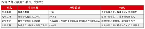 遼寧鐵嶺本是《紅樓夢(mèng)》續(xù)作作者高鶚的故里,但鐵嶺順手牽羊,公開宣稱是曹雪芹的“關(guān)外祖籍”,以全市之力打造“紅學(xué)文化之鄉(xiāng)”,2008年推出的“曹雪芹關(guān)外祖籍紀(jì)念地”項(xiàng)目是鐵嶺休閑度假區(qū)的10大項(xiàng)目之一,這10大項(xiàng)目總投資約3.8億元,建設(shè)周期為2年,年均經(jīng)營(yíng)收入4.3億元,投資利潤(rùn)率 33%,投資回收期為3年。