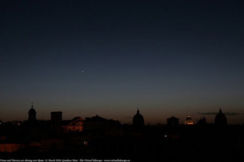 據(jù)美國太空網(wǎng)報道,近日,一名意大利天文學(xué)家拍攝到罕見的天象照片:水星和金星同時在羅馬的夜空閃耀。