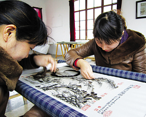 “兩會”剛結(jié)束,東臺發(fā)繡藝術(shù)館就著手合璧發(fā)繡的《富春山居圖》高級工藝美術(shù)師陳春生著筆臨摹了10天,在原《富春山居圖》繡作前端加上寬33厘米、長66厘米的《剩山圖》。藝術(shù)館特地挑選了有30年發(fā)繡經(jīng)驗的親姐妹單素蘭和單素萍來執(zhí)針刺繡。兩位繡娘經(jīng)過20天全日制滿負(fù)荷的工作,4月10日,《剩山圖》終于刺繡完成。