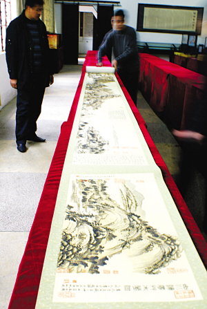 記者昨天在東臺發(fā)繡藝術(shù)館看到了合璧的發(fā)繡《富春山居圖》,裝裱后的全幅畫外徑寬40厘米,長1388厘米。