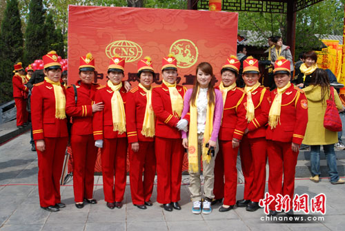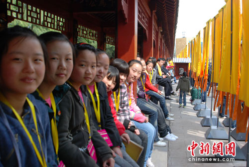 大典進(jìn)行時(shí),各項(xiàng)準(zhǔn)備工作就緒,拜祖場務(wù)人員在拜祖現(xiàn)場等候各項(xiàng)議程的工作安排,他們“忙里偷閑”和中新網(wǎng)直播主持人合影留念。參加放飛和平鴿的兩岸四地的小朋友們靜靜坐在亭子里等候。