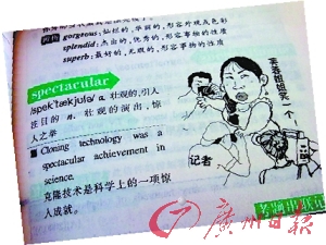 5月6日,芙蓉姐姐在微博上自爆,她由朋友處得知自己被印到了單詞本上做配圖。芙蓉姐姐在微博上寫道:“早晨上網(wǎng)時(shí),朋友發(fā)給藕一張圖,說是單詞本上的,這個(gè)舉例也太壯觀了吧……”芙蓉姐姐還發(fā)了圖片,記者看到其漫畫像被用于詮釋英文單詞“spectacular”(壯觀的、引人注目的)。至記者發(fā)稿時(shí)止,該微博被400多人轉(zhuǎn)載,有200多網(wǎng)友對此發(fā)表評論。