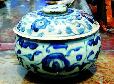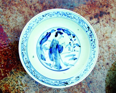 目前見到的文物種類主要是青花瓷大盤,此外也有青花瓷缽、青花小酒杯、青花碗、貼塑龍紋罐、銅板、鐵器及金屬凝結(jié)物等等。崔勇介紹,其中青花瓷大盤和帶蓋青花瓷缽是有代表性的器物,瓷胎和釉質(zhì)比較厚重,青花顏色不太鮮亮,發(fā)灰或者發(fā)黑,無(wú)論人物還是花草圖案都比較隨意,器表施滿釉,底足粘有細(xì)砂,即“砂足器”,屬于外銷瓷中的常見類型。