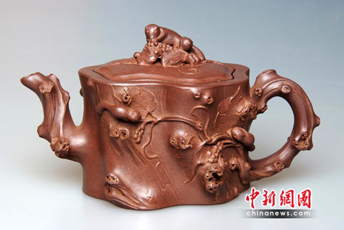 宜興紫砂與“世博”淵源頗深,歷史上曾多次參加世界性博覽會并獲大獎。記者現(xiàn)場看到,在歷屆國際性展覽中獲獎的6件珍品在展廳內(nèi)光彩耀目,其中在1910年“第一次南洋勸業(yè)會”上獲金獎的范大生“大柿子壺”、1915年美國巴拿馬國際賽會獲金獎的程壽珍“掇球壺”、1926年美國費城藝術(shù)博覽會獲金質(zhì)獎的馮桂林“松鼠葡萄壺”等珍品引來眾多文化藝術(shù)界人士爭相一睹芳容。