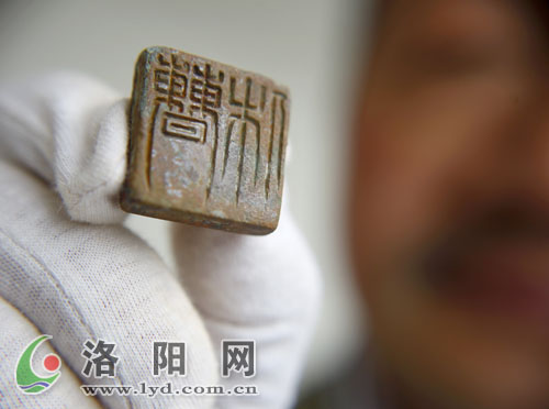 后室西南角的地面上,一方銹跡斑斑的印章赫然“躺”在地上!拔覀儺敃r激動得要命,考古中能得到文字性的東西,簡直就是驚天發(fā)現(xiàn)!”李光夫笑著說,當時,大家小心翼翼地將印章用密封袋保存,然后給領(lǐng)導(dǎo)打電話“報喜”。