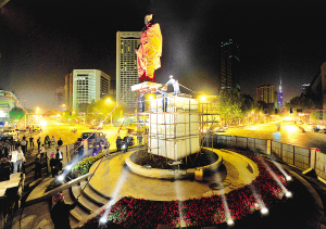 22:30,淮海路、洪武路、王府大街、長江路組成的新街口四環(huán)實(shí)施交通管制,新街口大轉(zhuǎn)盤馬上“清凈”下來。22:35,工作人員開始做吊裝前的準(zhǔn)備工作,首先是兩臺(tái)吊裝機(jī)駛近大轉(zhuǎn)盤南北向停放,緊接著工作人員將銅像下的原有基座切割掉后,吊機(jī)開始起吊銅像,為了平衡銅像,在銅像的四邊,都有人用繩子進(jìn)行牽拉,大約23:50銅像吊裝到基座上,工人開始對銅像進(jìn)行固定……截至記者發(fā)稿時(shí),銅像仍在安放中。